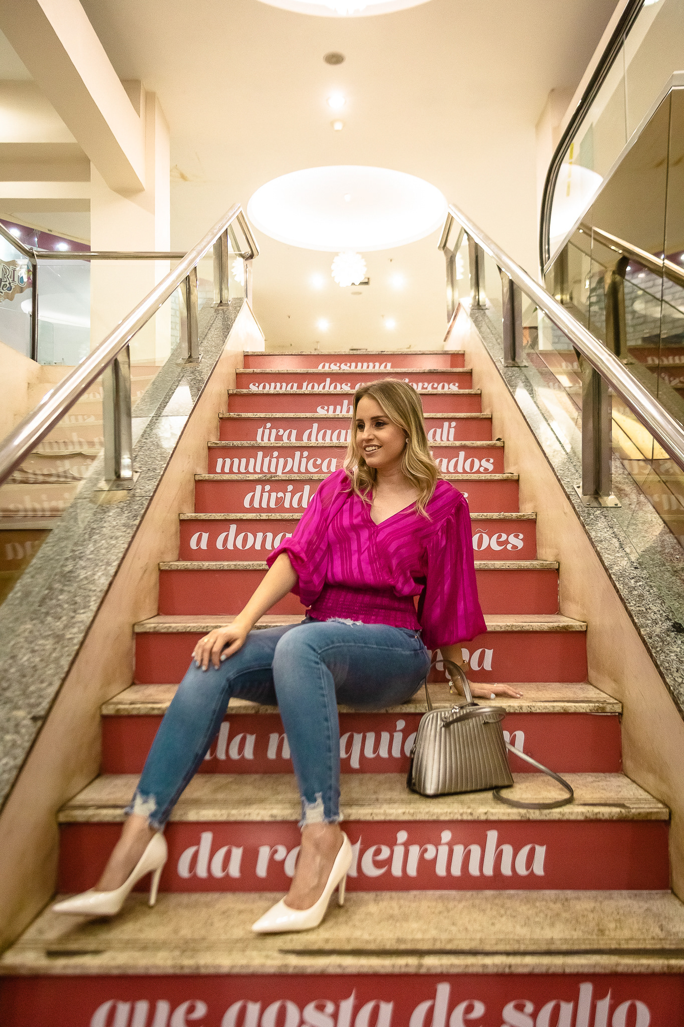 A partir dessas palavras-chaves que elas mesmas escreveram, criamos peças de contato para a ação. Backdrop para o dia do evento, totens espalhados pelo shopping com títulos que faziam parte da comunicação, além de uma escada instagramável com um degradê uniforme que se conectava em toda extensão, a cada degrau e partes com títulos de efeito e uma marca no chão com encaixe para que elas pudessem colocar seus pés, tirar uma foto, marcar o @ do shopping nos stories e assim reverberar toda a mensagem que estava sendo comunicada na ação e na campanha em sua totalidade de forma espontânea.